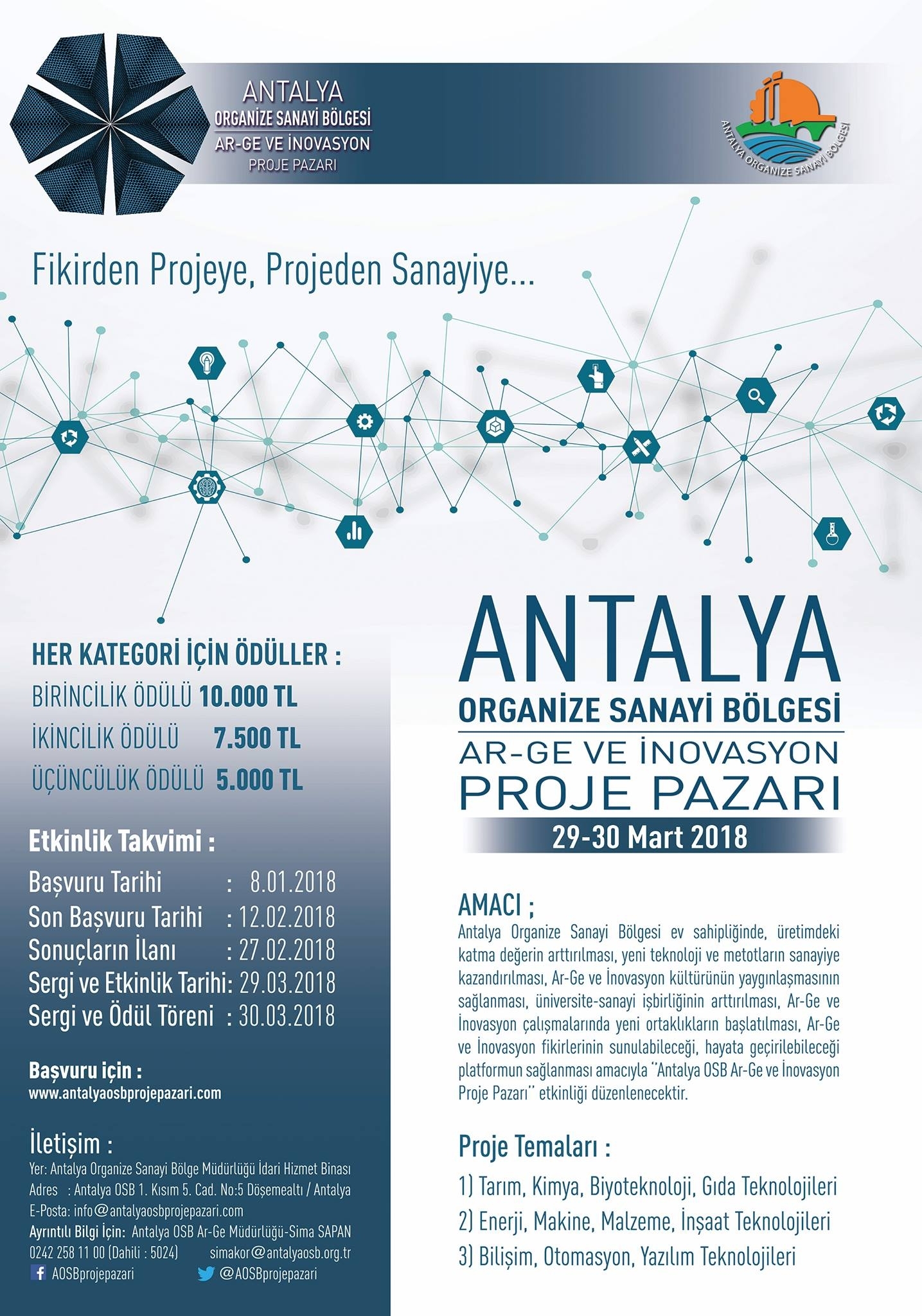 Antalya Organize Sanayi Bölgesi, üretimdeki katma değerin artırılması, yeni teknoloji ve metotların sanayiye kazandırılması, üniversite-sanayi işbirliğinin güçlenmesi, Ar-Ge ve inovasyon kültürünün yaygınlaşması amacıyla gerçekleştirdiği Antalya OSB Ar-Ge ve İnovasyon Proje Pazarı 2022 Etkinliğinin başvuru sürecini başlattı. Etkinlik kapsamında bir proje yarışması ve sergisi gerçekleştirilecek. Katılımcılar, ‘Tarım, Kimya, Çevre, Biyoteknoloji (Tarımsal ve Hayvansal), Gıda’ – ‘Enerji, Makine, Elektrik - Elektronik, İnşaat, Yazılım, Bilişim’ ve ‘Yapay Zeka, Sağlık ve Tıp Teknolojileri, Biyomalzeme, İlaç ve Kozmetikten’ oluşan 3 farklı kategoride geliştirdikleri ar-ge ve inovasyon temelli proje önerileri ile yarışmaya başvuruda bulunabilecek.